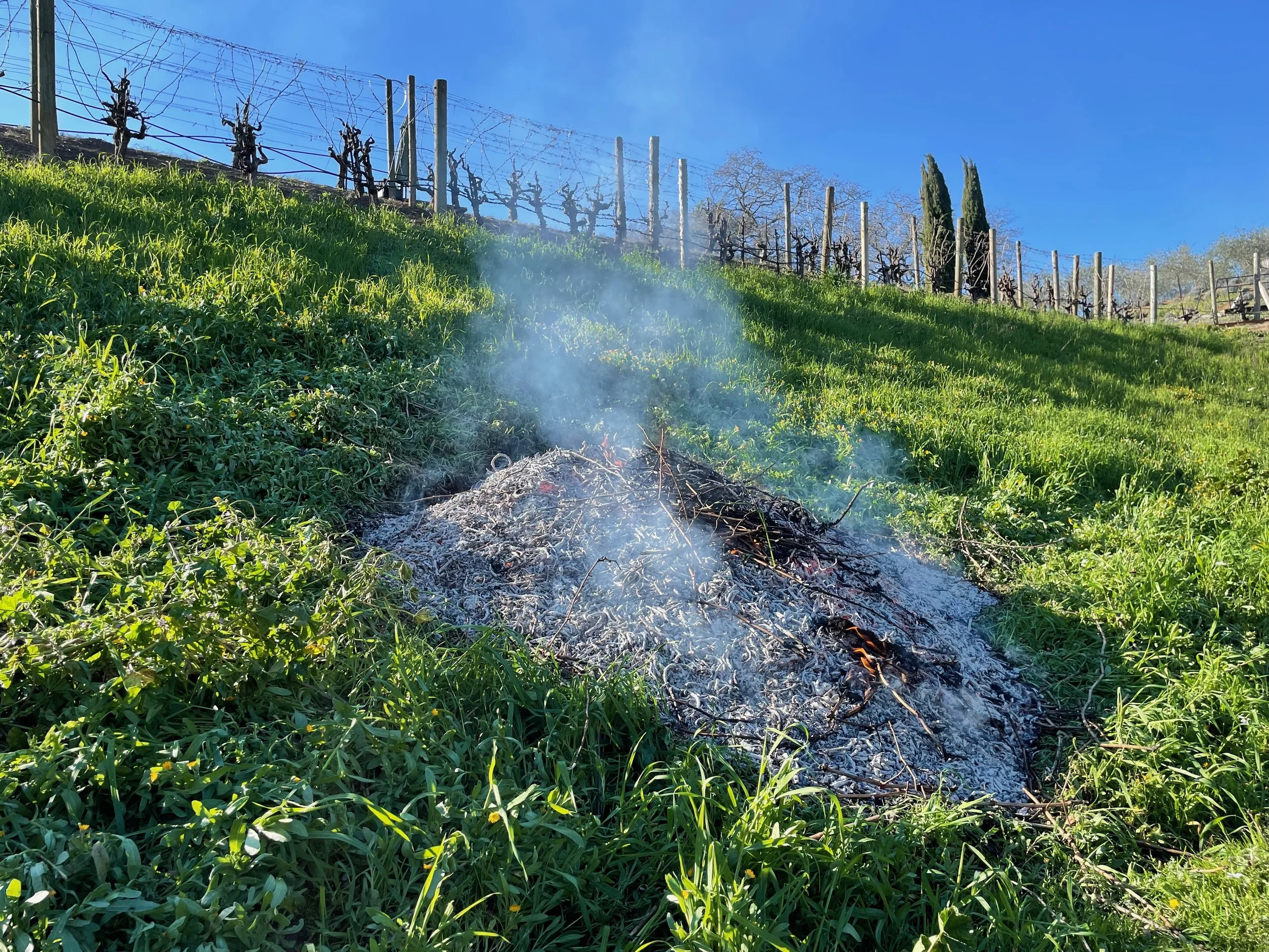 Every spring in wine country, it is not uncommon to see columns of smoke rising from different fields. The vineyard workers pruned the vines a couple months ago, leaving the canes in the middle of the rows before collecting them into large piles in an open field. The canes must dry even more before they will burn properly.