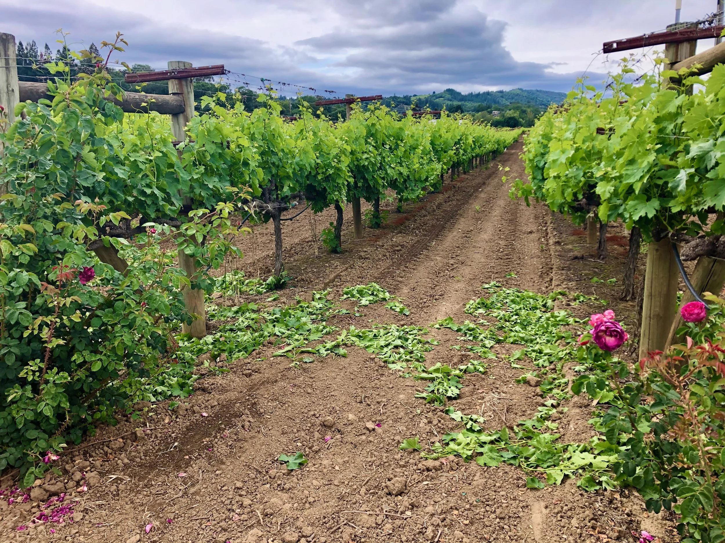 Once the suckering is done (or sometimes at the same time) a vineyard crew will go along each row of vines and very carefully tuck the still-pliable, tender shoots of each vine up onto the trellis. Once they are tucked, leaves that would interfere with sunlight on the fruit are pulled off and dropped to the ground. Now, the nascent fruit will be well-positioned to ripen into the beautiful fruit that is desirable for wine.